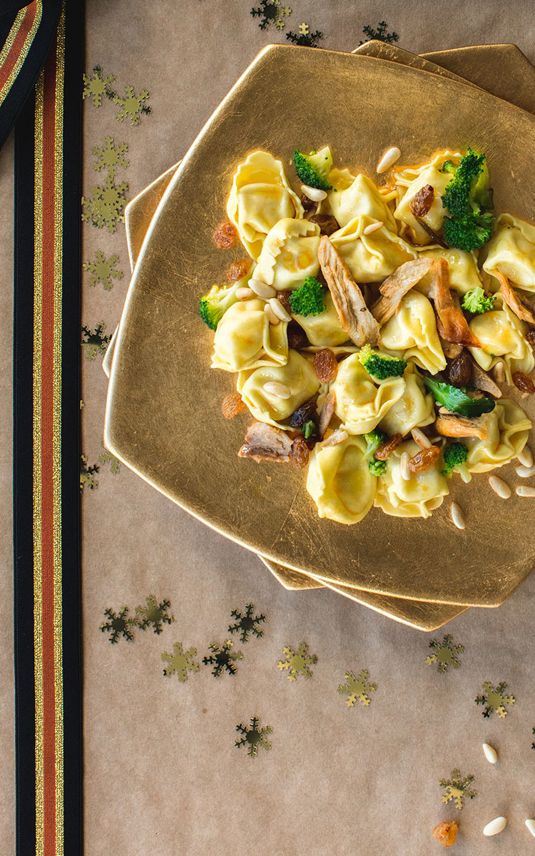 Tortellini Fiambre e Queijo com Brócolos, Pinhões e Passas
