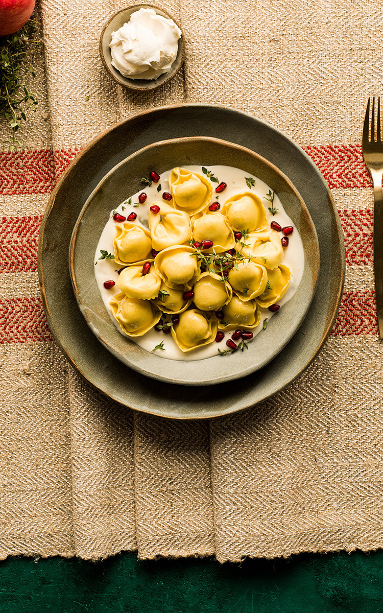 Tortellini Fiambre e Queijo com Creme de Mascarpone, Romã e Tomilho